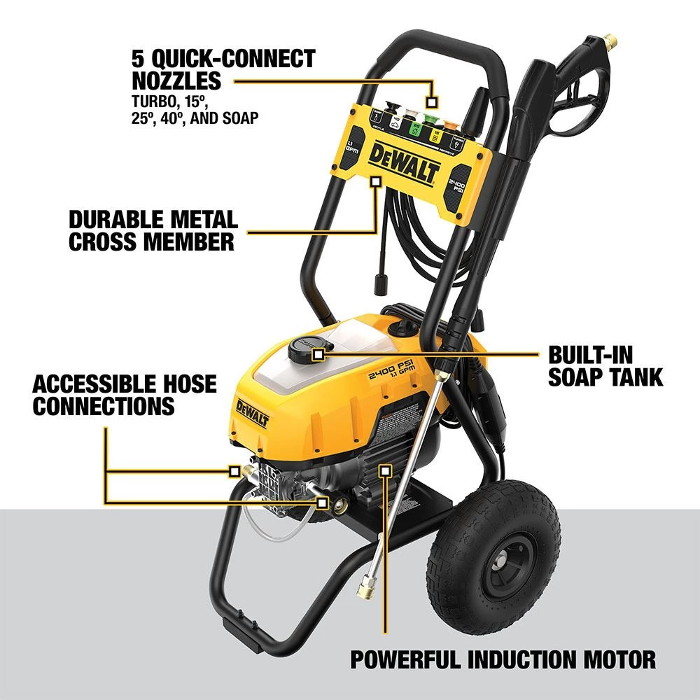 You can rely on the durable, mobile, and powerful DEWALT 2400 psi Pressure Washer, delivering enough power to handle your outdoor cleaning tasks. Be prepared to tackle just about any job or wash your vehicle with the accessories you need. This Cold-Water Pressure Washer comes equipped with five nozzles, including a Turbo nozzle and built-in storage for organization. Built to transport over rugged terrain, the pressure washer features premium 10 in. pneumatic wheels so you can take it to the jobsite. The 2400 PSI Cold-Water Pressure Washer is backed by a 3 Year Limited Warranty.