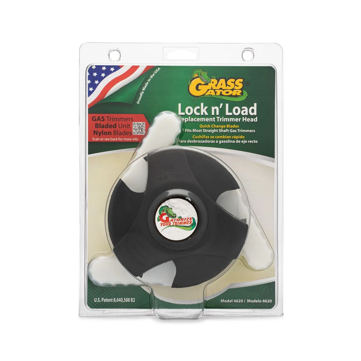 GrassGator Lock n’ Load Replacement Trimmer Head Model 4620. Fits most straight shaft gas trimmers 25ccs or more and some curved shaft gas trimmers 27ccs or more. Bladed unit. 3 tough nylon blades to cut tall grass and weeds in open field applications. Use GrassGator replacement blades model 4610. Quick blade change. No need to remove the head to change blades. Do not use vertical or for edging.