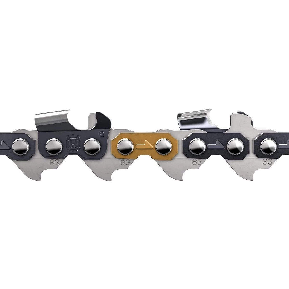 The new X-CUT S83G is a semi chisel, 3/8″ pitch, .050″ gauge, guarded chain designed, built and tested right next to our Husqvarna chainsaws. A robust and pre-stretched semi-chisel chain with guarded drive link for reduced kick-back and with a sharpness that lasts longer, high cutting efficiency and less need for maintenance, all saving you both time and costs. Thanks to the semi chisel cutter profile it’s less sensitive to dirt and easy to file. Like all X-Cut chains it’s equipped with a golden tie-strap, indicating the logger where to start and stop filing. With this reliable X-CUT chain you will be ready to cut more in less time straight out of the box.