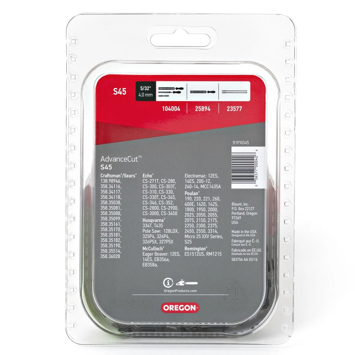 Designed for homeowners and occasional chainsaw users, the Oregon S45 AdvanceCut Saw Chain is a low-vibration, low-kickback chain featuring Chamfer Chisel cutters with twin cutting corners for outstanding performance.