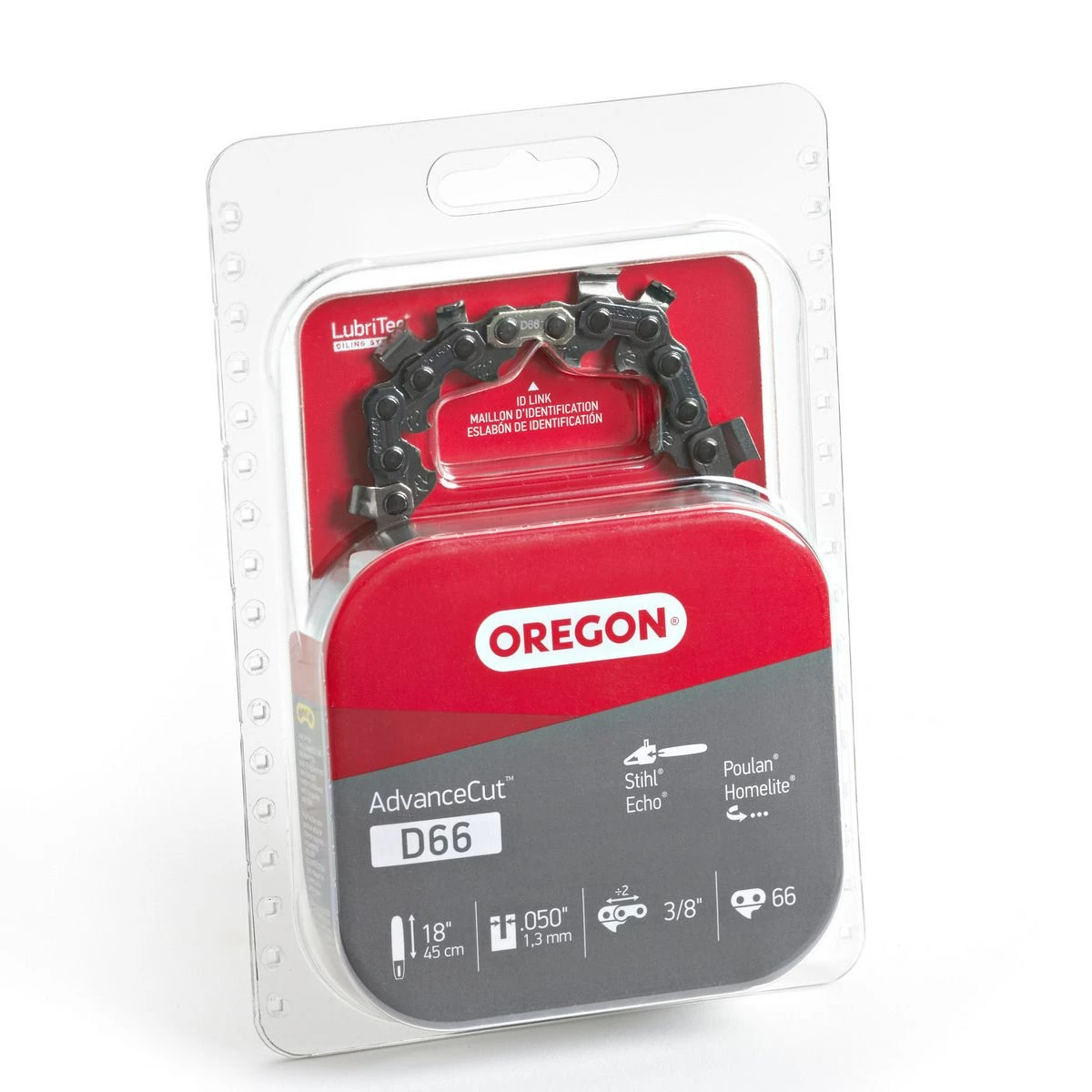 The D66 AdvanceCut Saw Chain is a low kickback chain that is ideal for occasional and commercial chainsaw users. The low-vibration full chisel cutters offer top performance while also providing a smooth cutting experience via our patented bent over depth gauge. This chain fits saws from several manufacturers including Stihl, Echo, Homelite, Remington and John Deere.