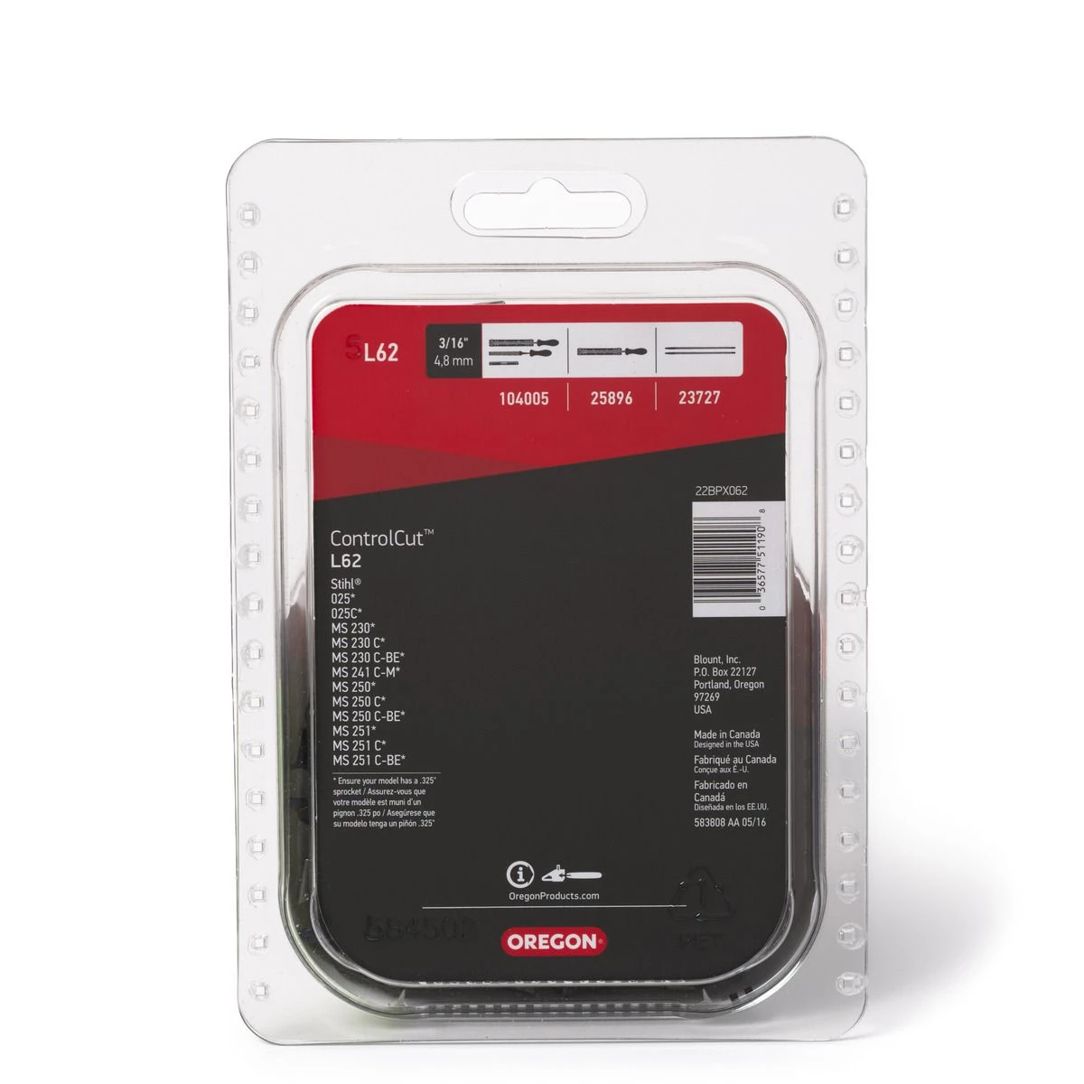 Designed for occasional chainsaw users including property owners and commercial cutters, the L62 ControlCut Saw Chain features low-vibration Micro Chisel cutters with small-radius working corners for excellent performance and easy maintenance. This .063″ gauge, .325″ pitch chain has a low kickback design. Compatible fit with Stihl 26RM3 62 as well as Husqvarna H 28 62.