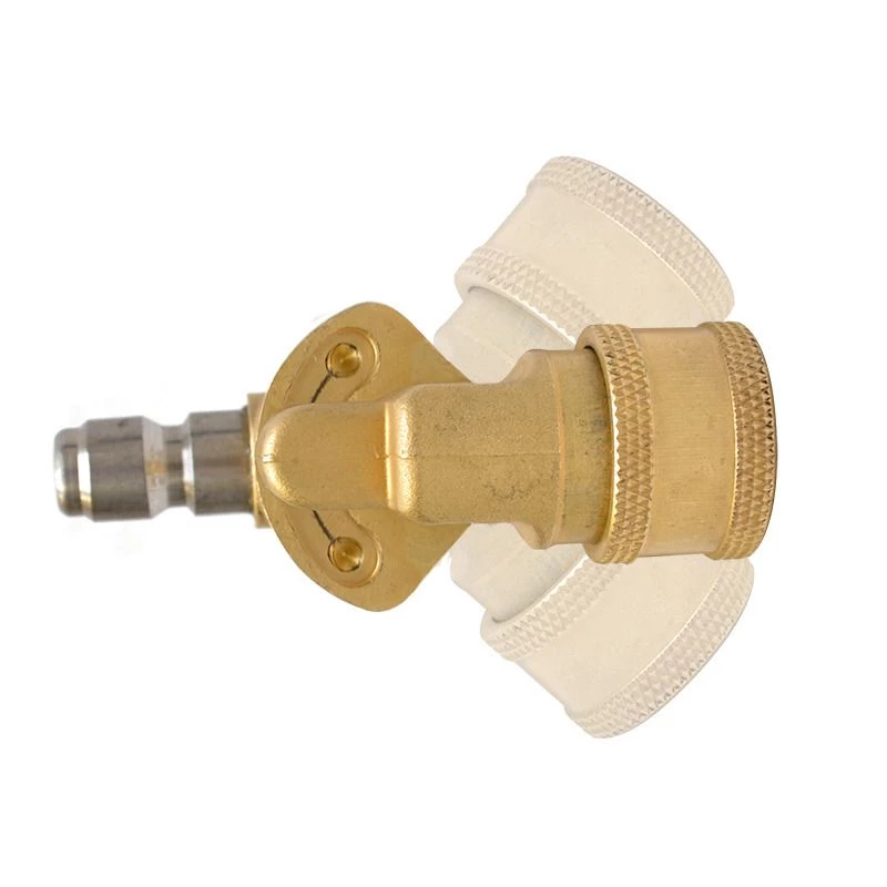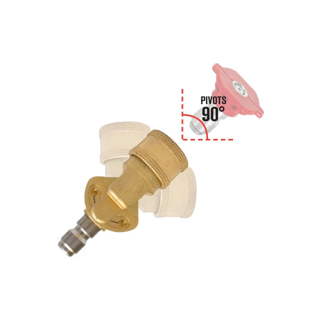 Pivot to saving time with the Valley Industries Universal 90 Degree Pivoting Coupler. In seconds, connect this coupler to a power washing wand and quickly tackle hard to reach pressure washing applications such as cleaning gutters or under cars. Easily adjust 45 degrees up or down depending on the application and stay locked in with the locking mechanism. Comes standard with quick connect outlet for easy adding/remove of pressure washer nozzles. Compatible with gas and some electric pressure washers that handle up to 4,500 PSI. Construction made of heavy-duty brass for corrosion and wear resistance.